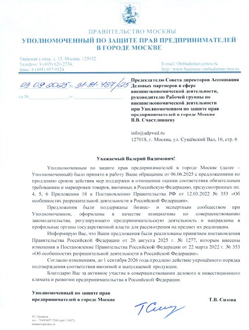Уполномоченным по защите прав предпринимателей в городе Москве (далее — Уполномоченный) было принято в работу Ваше обращение от 06.06.2025 с предложениями по продлению сроков действия мер поддержки в отношении оценки соответствия обязательным требованиям и маркировки товаров, ввозимых в Российскую Федерацию, предусмотренных пп. 4, 5, 6 Приложения 18 к Постановлению Правительства РФ от 12.03.2022 № 353 «Об особенностях разрешительной деятельности в Российской Федерации».